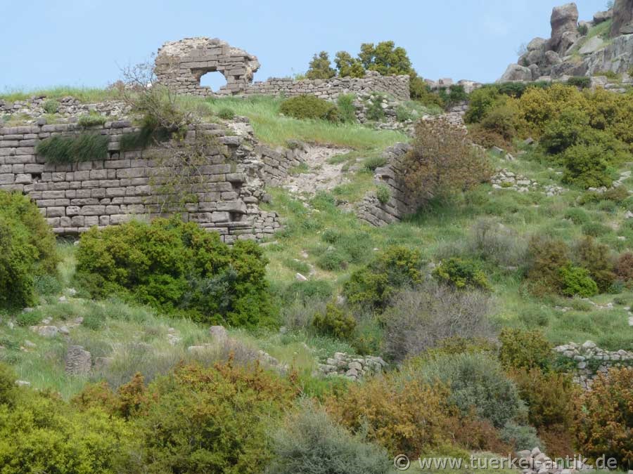 In the city area, on the slopes between the Agora and the sea, the Agora with its two-sided halls, the Buleuterion, the Gymnasion, the theatre and a Roman thermal baths are still preserved today. Outside the city wall is a well-preserved necropolis with tombs and sarcophagi. |