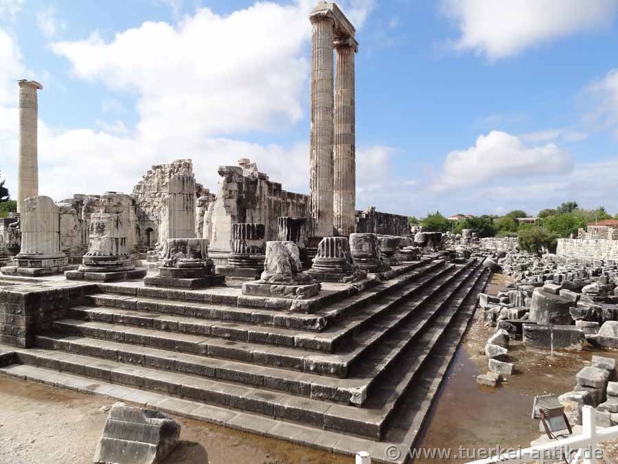 Herodotus, the father of historiography, reports that the Ionians immigrated around the turn of the 1st millennium B.C. and took over an older place of worship, where in pre-Greek times a female natural deity was venerated. However, this has not yet been verified archaeologically. According to legend, Leto gave birth to her son Apollo at the oracle site of Zeus. The legend goes on to say that Apollo later appeared to a local shepherd named Branchos and gave him the gift of vision. The Carian priesthood of the Branchids, who until the Persian Wars were the namesakes and rulers of the Shrine, traced back to these shepherds. The priests of the Shrine were later also appointed in Miletus and belonged to prestigious families of the city. The oracle probably had an international reputation as early as the 7th century BC. This is proven on the one hand by Herodotus, who reports on consecration gifts from the Egyptian Pharaoh Necho and the Lyder King Kroisos, and on the other hand by the actual discovery of numerous consecration gifts. Herodotus reports that the Persian king Darius plundered the temple and burnt it down after the fall of Miletus in 494 BC. Other sources report a destruction in 479 BC by the Persian king Xerxes. Archaeological evidence of fire destruction cannot be found for either 494 or 479 BC. The fact is, however, that no new construction measures have taken place over the next 150 years. In the last third of the 4th century BC, the previously regional sanctuary became part of the city of Miletus. Milet gave the order to build the new temple of Apollo and appointed yearly officials and sacrificial priests. The religious operation of the oracle came to a standstill in the course of the 4th century with the onset of Christianity. In late antiquity Didyma was bishop's seat and was honoured by Emperor Justinian I. with the title Iustinianopolis, before the place experienced a rapid decline in the early Middle Ages. From the 10th to the 12th century Didyma was once again the seat of a bishop. Twice, in the 7th and 15th centuries, earthquakes destroyed Didyma. The latter led to the abandonment of the settlement. It was not until the end of the 18th century that the town was resettled. The place has been explored since the 18th century. First by English, then French, finally by German archaeologists. According to this, found objects from Didyma can be found in the British Museum in London, the Louvre in Paris and the Pergamonmuseum in Berlin. |