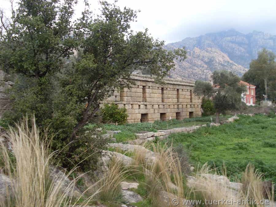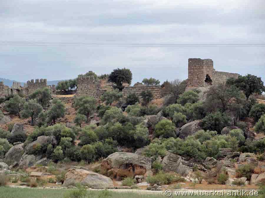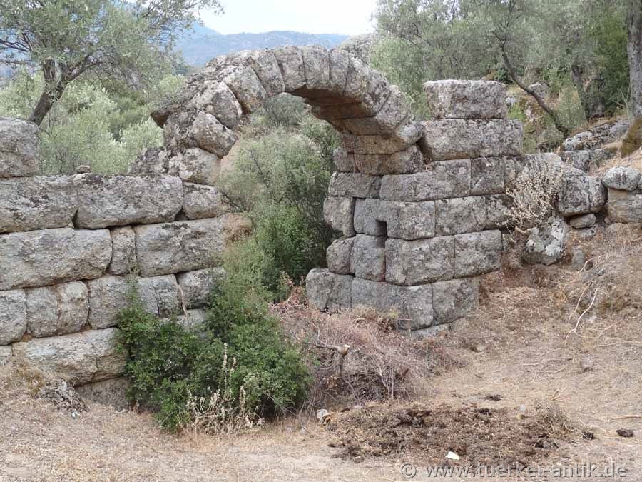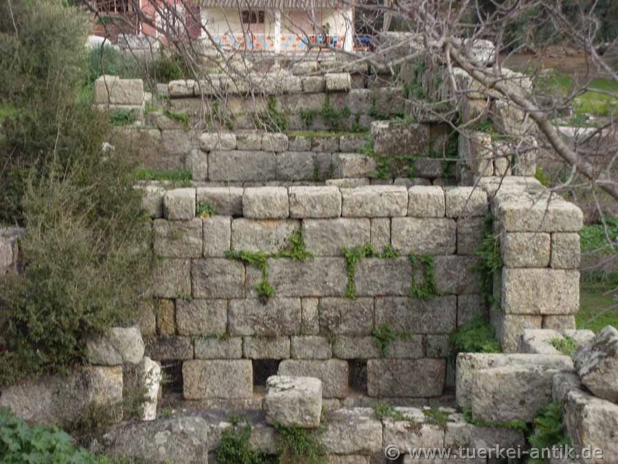The 6.5 km long, 2-3 m wide walls, some 6 m high and reinforced with 65 towers, are an excellent example of Hellenistic fortifications. Also known are the Agora (forecourt of today's village school) and an Athena temple west of it.