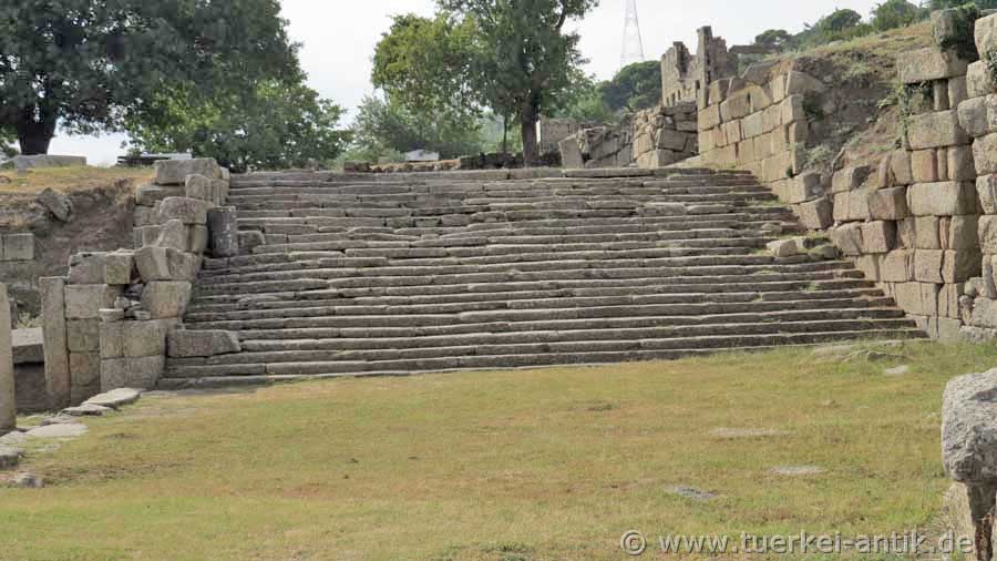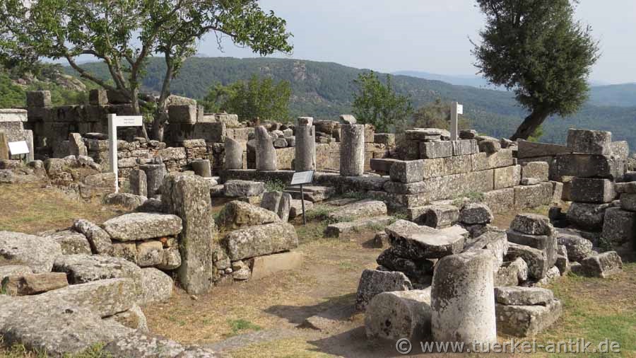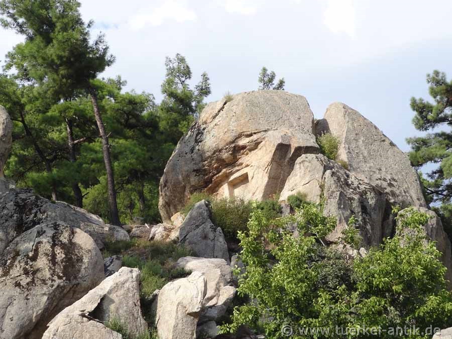 The remains of the cyclope-like masonry of the sanctuary stand about 700 metres above sea level on a platform halfway away from the valley and rise in front of a rock face split by a prehistoric lightning strike. From Mylasa an extended procession road led to the complex, which is still visible from the city today. |