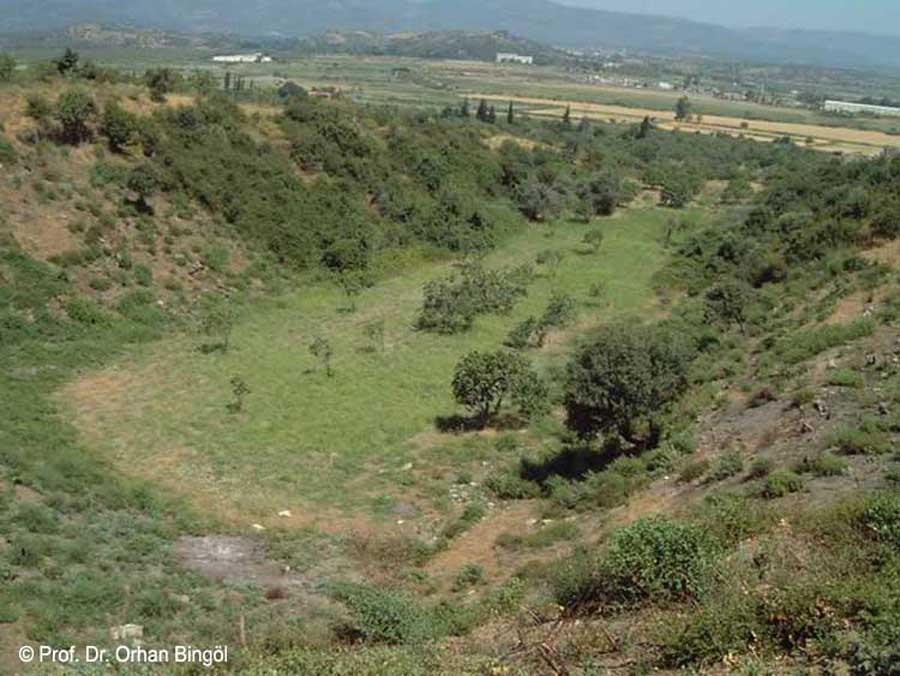 The existence of a stadium was known from ancient writings. Still in 1984 one could only guess that it could have been located in the horseshoe-shaped depression in the eastern part of the former urban area. Only the shape of the valley suggested a stadium. |