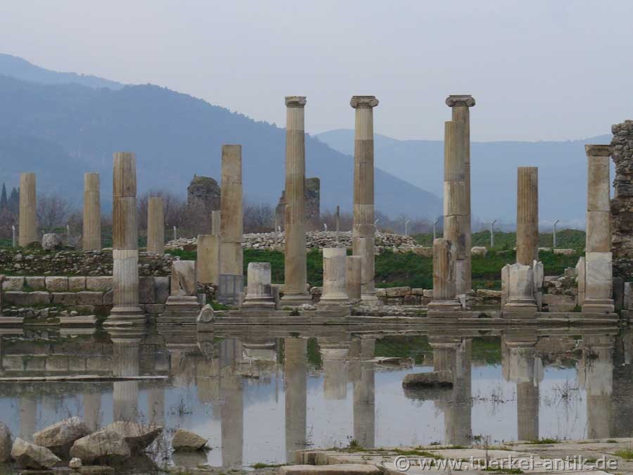 According to legend, the city of Magnesia was founded a generation before the Trojan War by the magnets from Thessaly. Through Alexander the Great Magnesia became Macedonian, fell to various Diadochi, became Seleukidic and experienced its cultural heyday with the Kingdom of Pergamum in the 2nd century B.C. Magnesia is mentioned in the works of Herodotus, Diodorus Siculus and Pausanias, among others. A war with Miletus ended in 196 BC with a peace agreement, after 190 BC the city was freed by the Romans. |