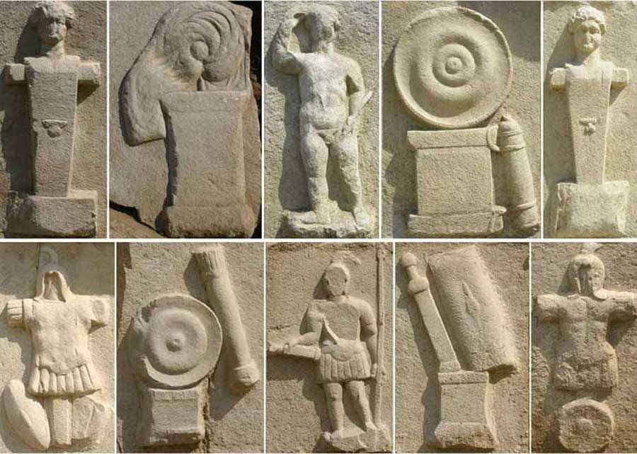 The transition from the rows of seats to the ground of the arena was decorated in places with relief plates showing scenes of the competitions. Some of these reliefs have been preserved and can still be admired in their original form on site. It remains to be hoped that the rather primitive grids in front of these almost 2,000 year-old reliefs will prevent art thieves from stealing them. |