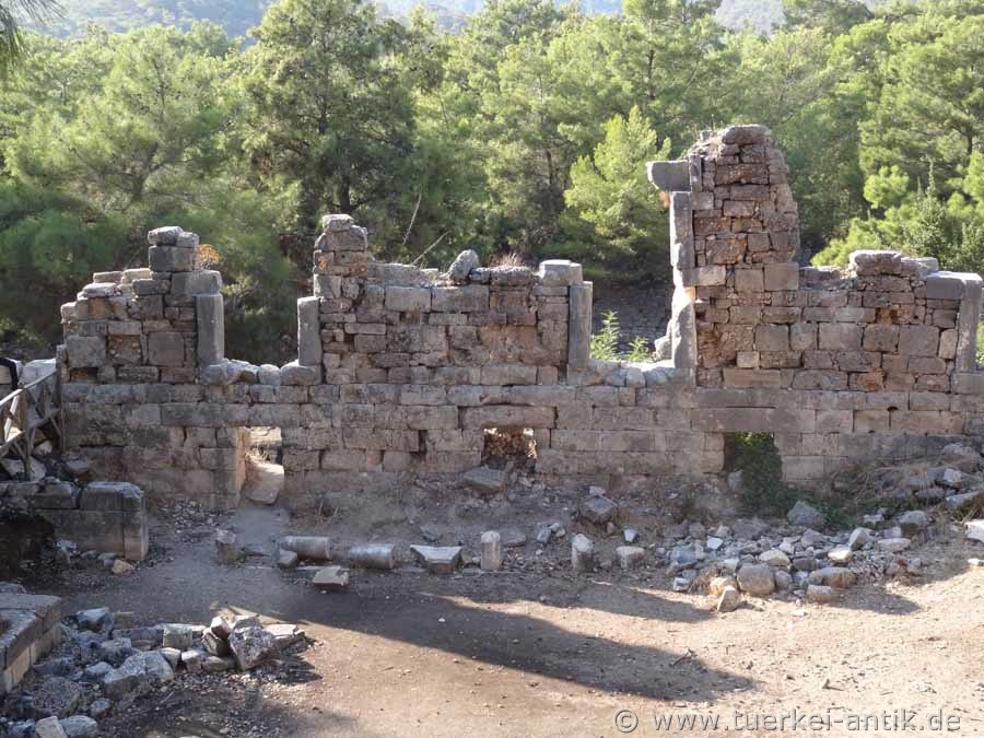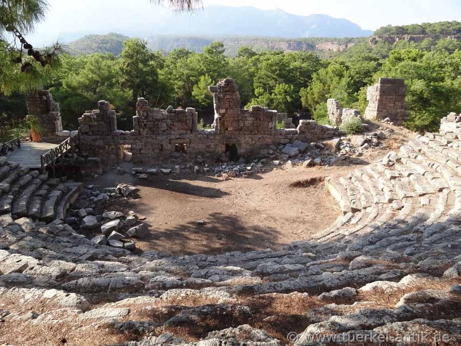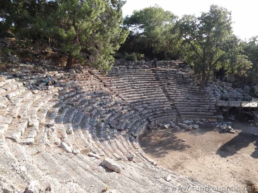 According to sources, the town was founded around 690 BC as a Rhodian colony. It belonged to the Persian Empire for a long time from about 550 B.C. - a position that was culturally and economically important for many small Asian Greek cities. Politically, however, this was used as a pretext in Athens to camouflage the Athenian activities of the Attic Sea Alliance as an anti-Persian combat alliance. After 411 B.C. again Persian, Phaselis surrendered to Alexander the Great in 333 B.C.. During the Wars of the Diadochi it was first Ptolemaic (until 197 B.C.) then Seleucidal (until 187 B.C.). Although it belonged to Pamphylia, it was incorporated into the Lycian League under Roman rule until about 100 B.C.. The city flourished during the Roman period, when it was known as a flourishing commercial centre. From here, wood, rose oil, perfumes and fragrant creams were exported. Although Phaselis was until Byzantine times a naval and trading base with some prosperity, today's building stock is not very impressive. The Seljuks had used the city as a quarry for the extension of Antalya's fortifications. A theatre, an aqueduct and a boulevard running across the peninsula between the former galley port and the commercial port have been preserved. The city's acropolis has not yet been excavated. |